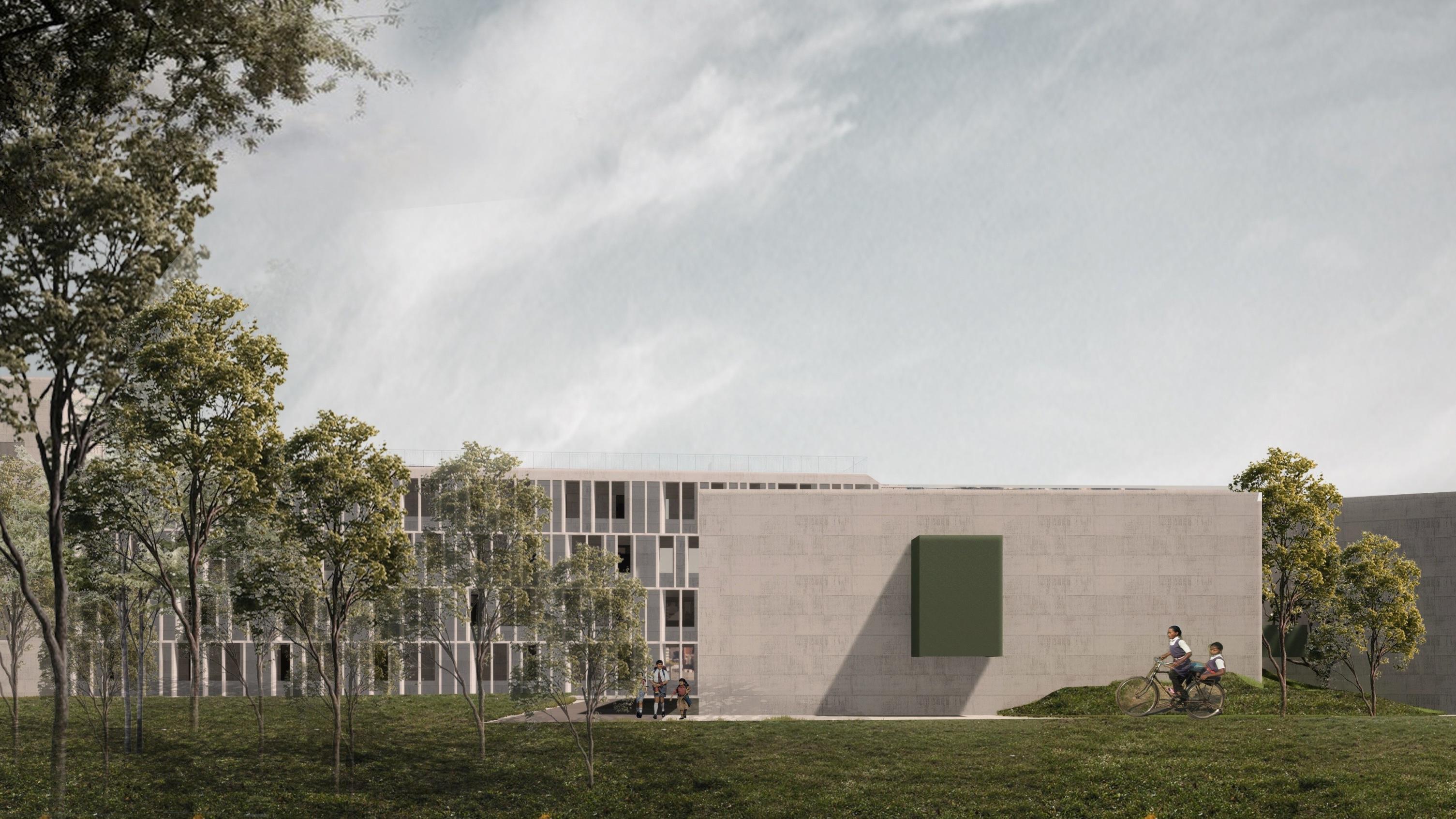 The design adheres to a modular language common to all these prototype schools, but includes specific adaptations for this site. In this case, the design revolves around two main blocks that pivot around a set of large existing trees.
