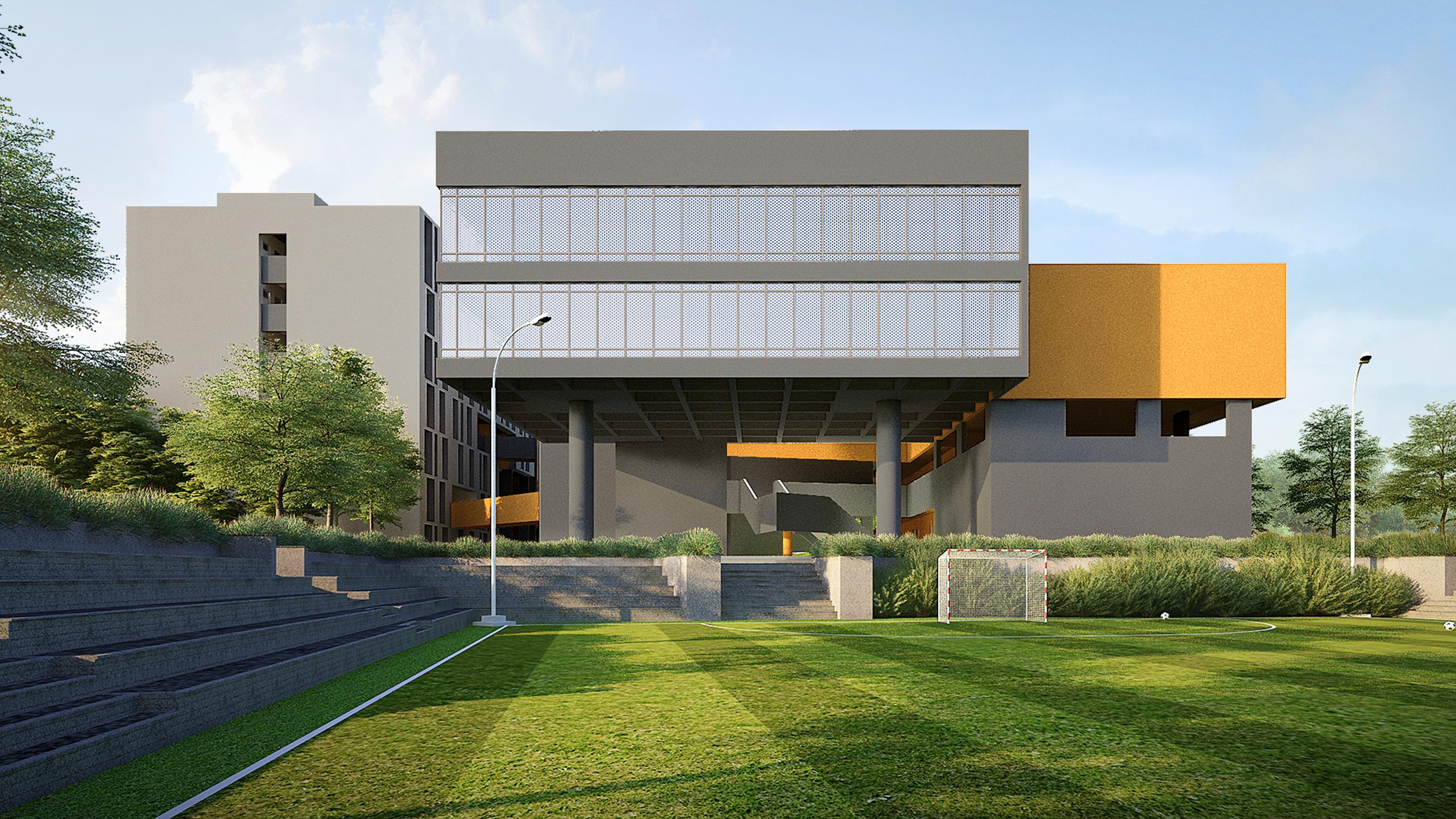 The design of the school seamlessly integrates nature into its architecture, creating a form that harmonizes contrasting elements.