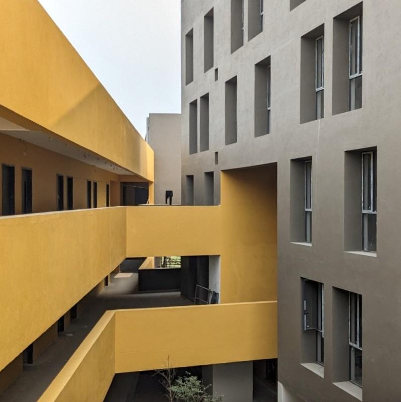 The facade's elemental play enhances the building's aesthetic appeal, transforming it into more than just a school. It is designed to be inviting and admirable both from the outside and within, featuring stunning courtyards and green pockets that further enrich the environment.