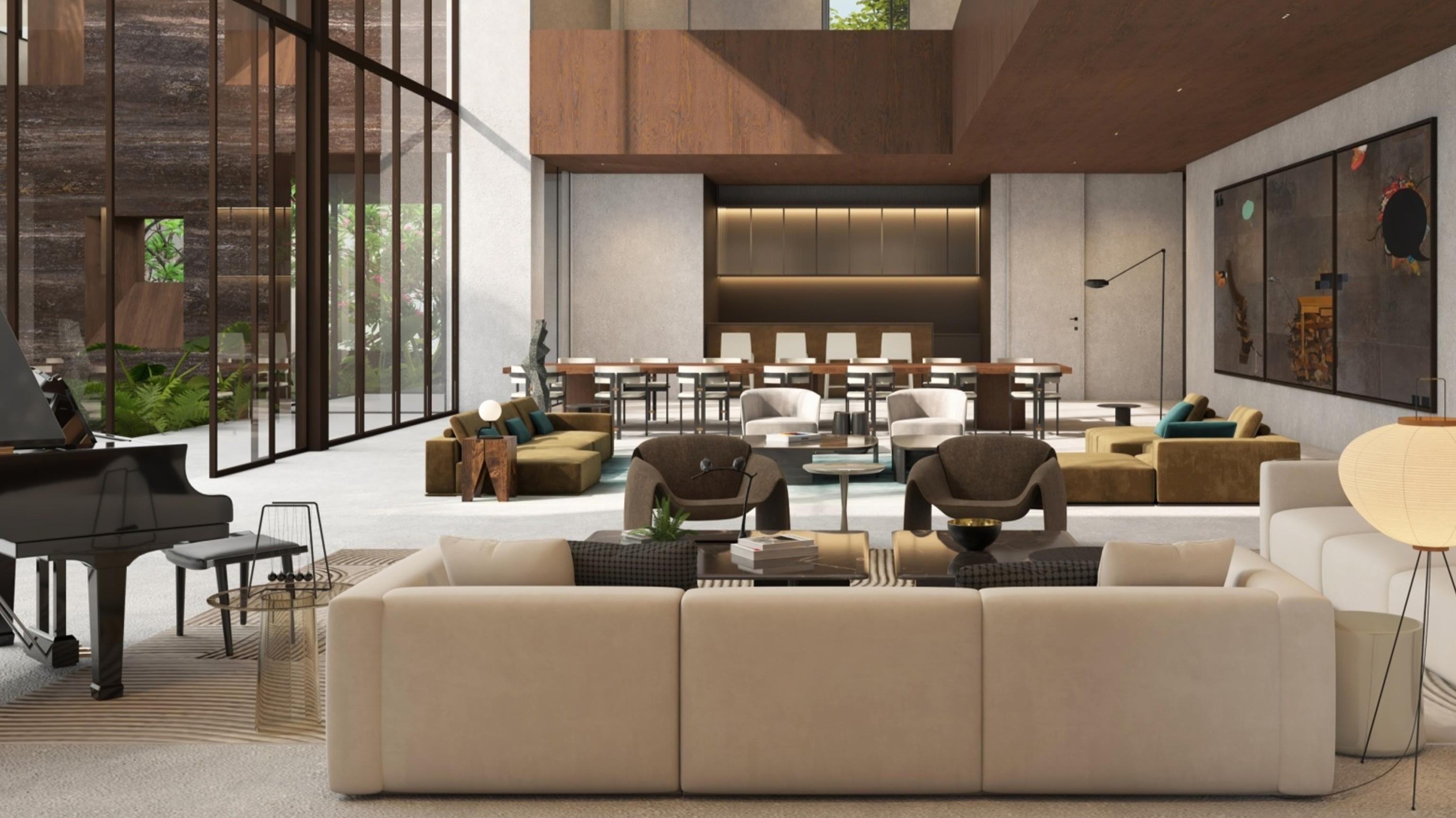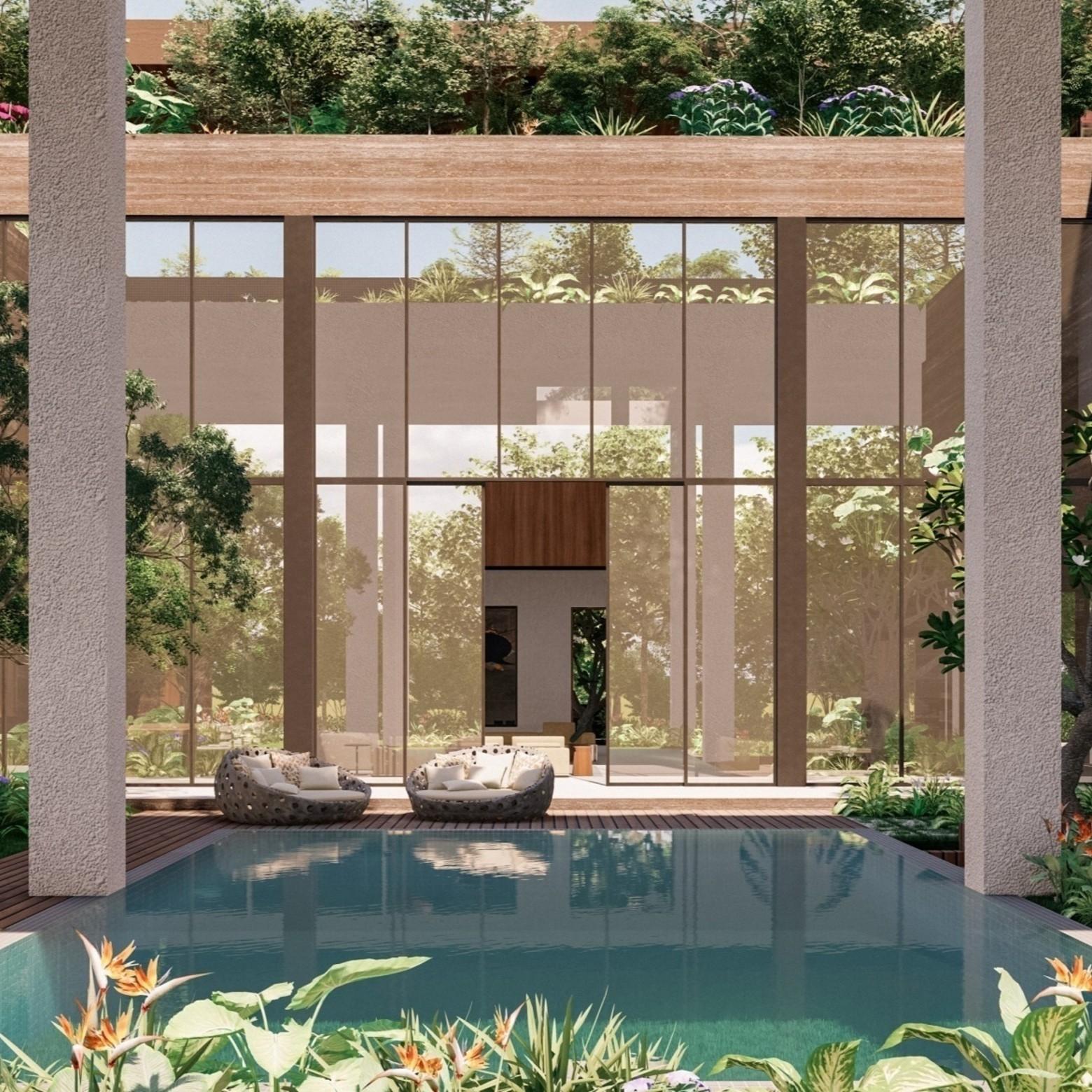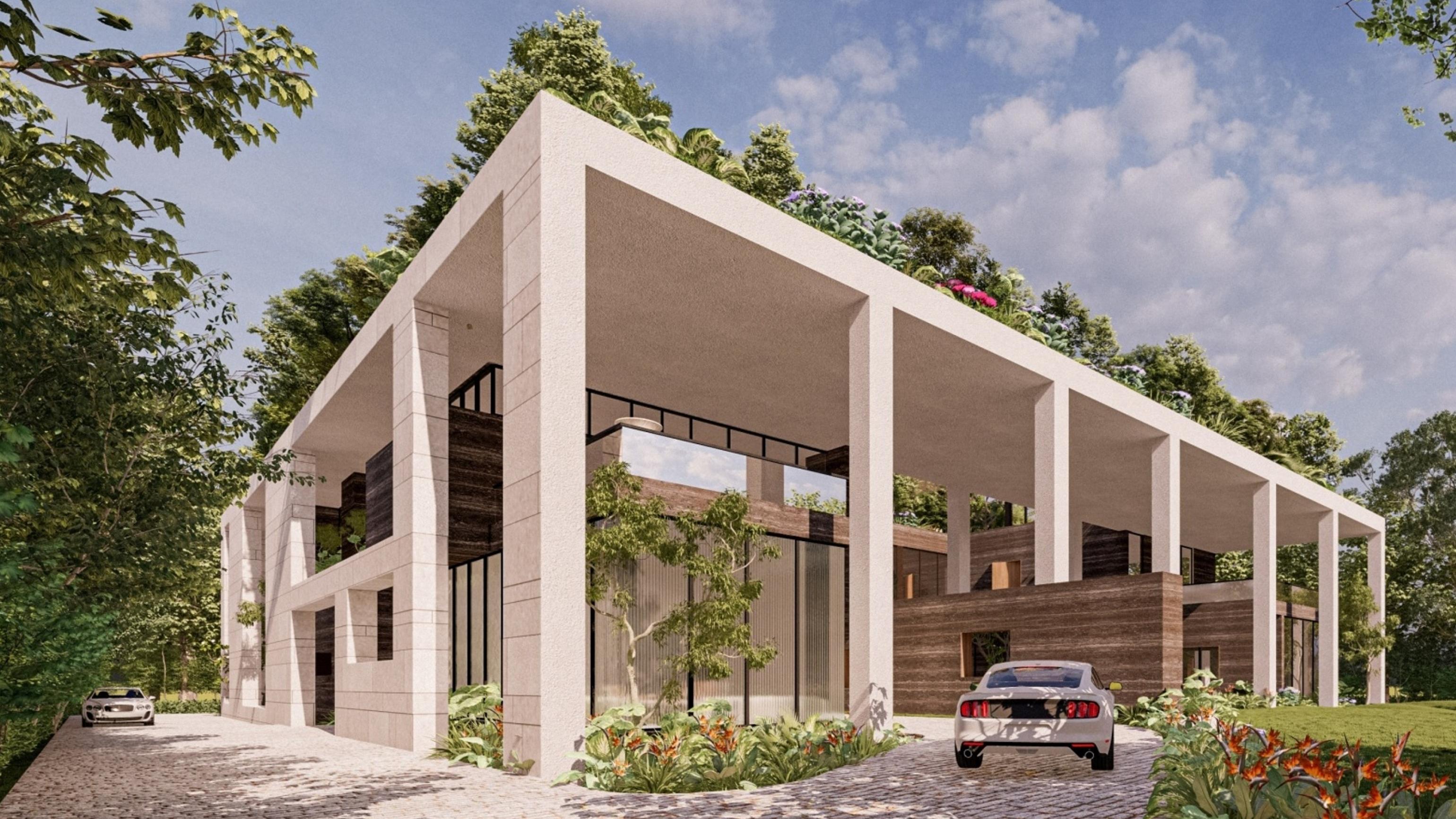 The villa presents itself as a blend of varying volumes nestled beneath a canopy upheld by slender columns. Upon entering, it reveals diverse spaces that invite one into its inner sanctum. A captivating feature of the design is how these spaces converge.